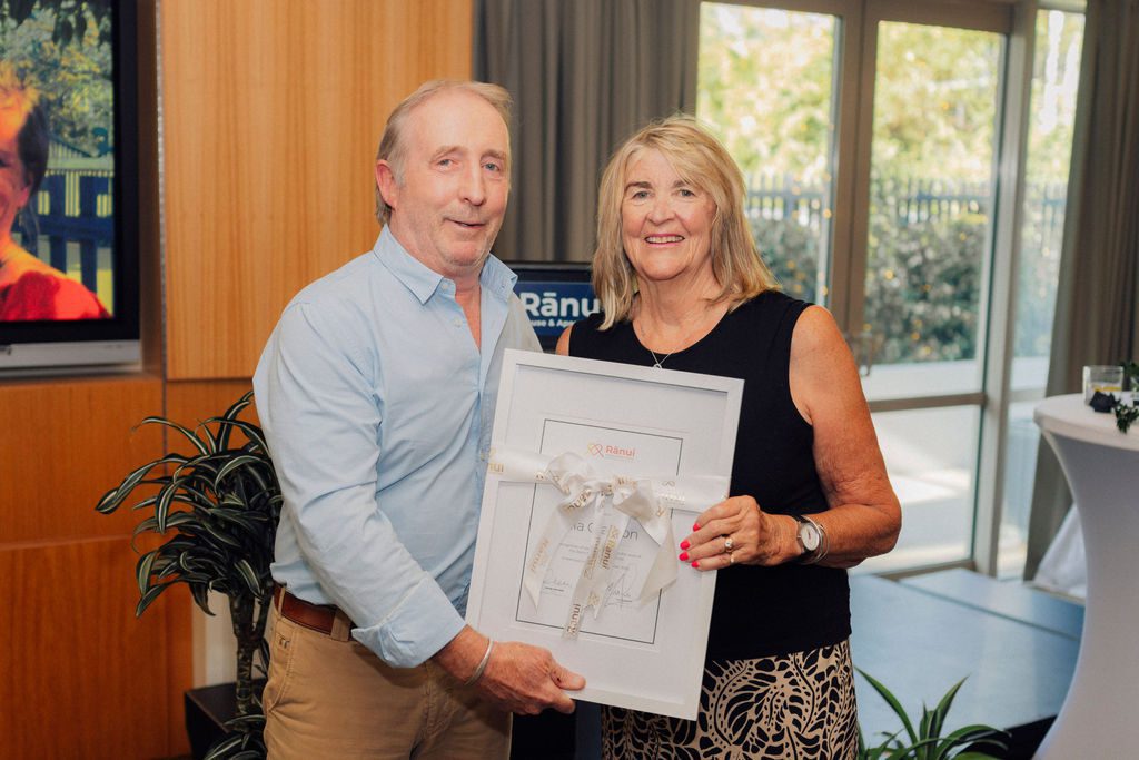 Photo: Cilla Glasson receives her Honorary Life Membership from BMCT Chairman Max Bremner at the Friends of Rānui event, 11 December 2025
